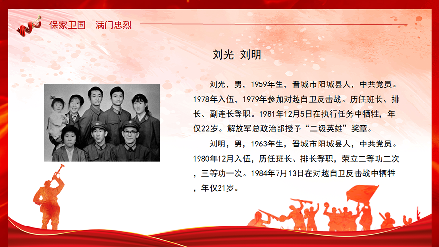 刘明,男,1963年生,晋城市阳城县人,中共党员。1980年12月入伍,历任班长、排长等职,荣立二等功二次,三等功一次。1984年7月13日在对越自卫反击战中牺牲,年仅21岁。